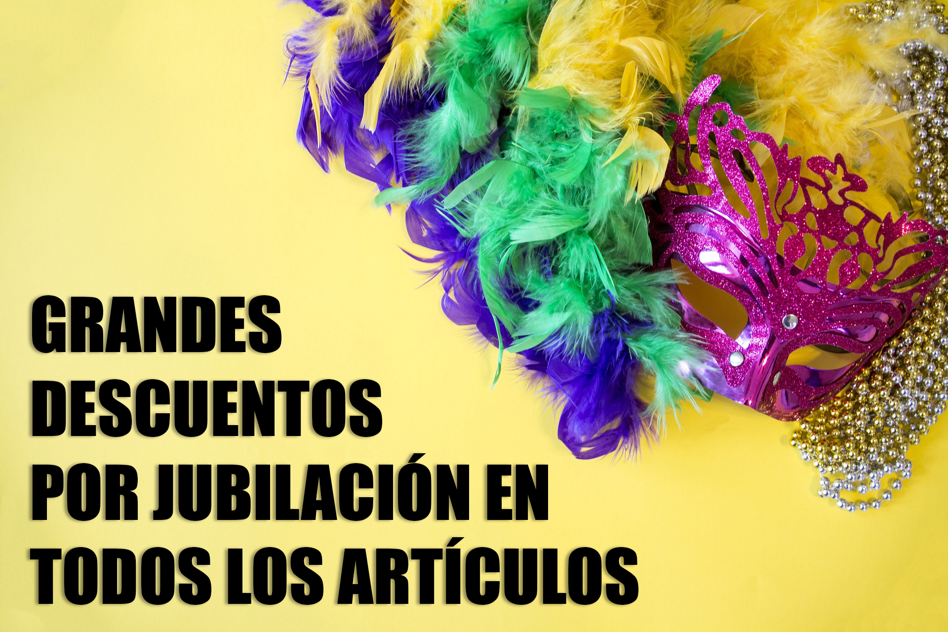 Disfraces para todas las edades: Pelucas, barbas, bigotes… Sombreros de fieltro y flocados. Plumas de colores, boas, marabú. Caretas de látex, antifaces… Coronas de rey, turbantes. Collares, brazaletes, broches, anillos… Maquillajes, látex, dermogun… Escarcha micra de varios colores. Pitos de murga profesional. Artículos para bromas. Artículos de halloween. Bolsas de cotillón. Serpentinas, papelillos, matasuegras… Artículos para despedidas de solteros. Cadenetas, flecos, farolillos… Piñatas, globos, infladores… Maillots, medias, guantes… Espadas, tridentes, hachas, lanzas… Dentaduras, narices, orejas… Platos, vasos, manteles